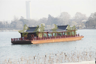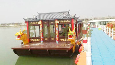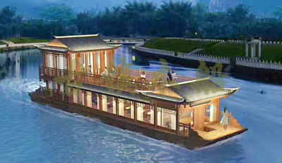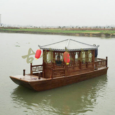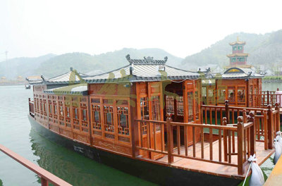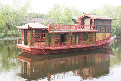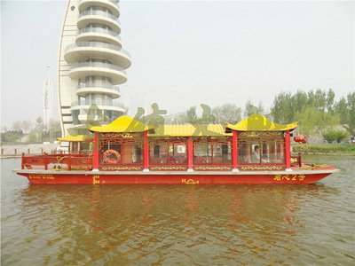畫舫船就是裝飾古典華麗的游船,是"中國風(fēng)"的仿古游船,結(jié)合古典園林建筑,體現(xiàn)了中華文明的古典藝術(shù).畫舫船豪華而又古典,船上的建筑按照中國古代建筑里的亭臺樓閣,建筑工藝之復(fù)雜,要求之嚴(yán)格,仿古畫舫游船的特點(diǎn)飛檐翹角、玲瓏精致的四角亭子逐漸成形,赫然立于船頭,美人靠、盤龍柱子、彩畫……龍柱上的浮雕盤龍和祥云一層扣著一層,層層錯(cuò)落有致,雕刻精細(xì)到盤龍身上的每一個(gè)鱗片都細(xì)細(xì)可數(shù),古代皇家標(biāo)志性元素,在畫舫船上體現(xiàn)的淋漓盡致。除了雕刻、花窗,整條船還有一個(gè)看點(diǎn),那就是弧線優(yōu)美、高高翹起的船尾。游船并不大,長約10米、寬3米,但是整體看起來堪稱一件藝術(shù)品。船尾的雕花欄桿與船艙、船頭的雕刻遙相呼應(yīng),船身四周貼著浮雕祥云,給整條船增添了富貴、華麗的氣質(zhì)。